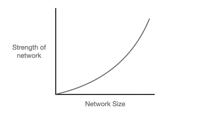 Network effects are when every new user to the network adds more value to existing users. Mathematically, a network effect can be represented as V=N². Where V is defined as network strength and N is the size of the network.